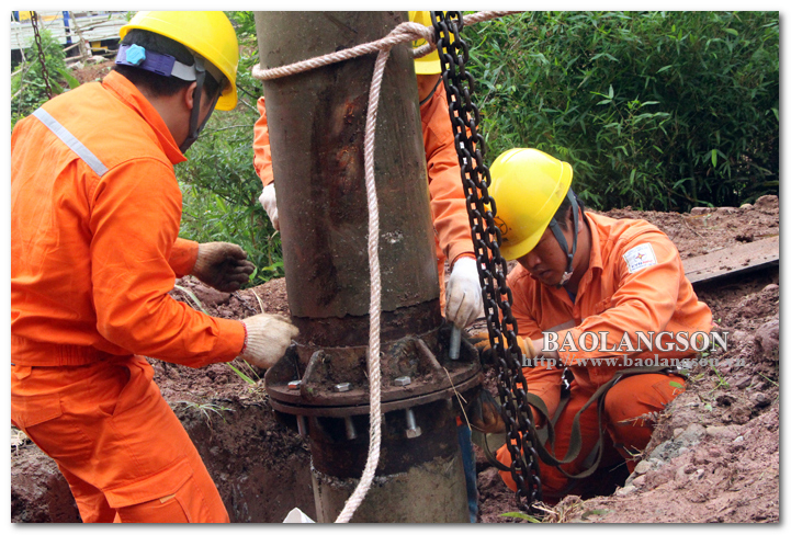 Nhân viên Điện lực Bình Gia lắp đặt cột điện bê tông kiên cố thay thế cột gỗ xuống cấp.