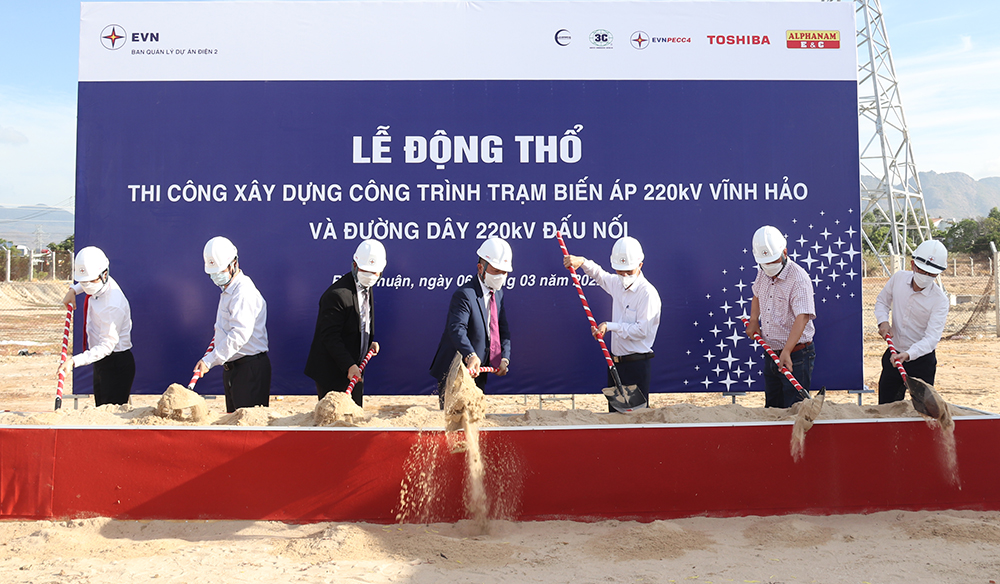 Ngày 6/3, tại Bình Thuận, Ban Quản lý dự án điện 2 phối hợp với các nhà thầu tổ chức triển khai xây dựng công trình Trạm biến áp 220kV Vĩnh Hảo và đường dây đấu nối. Dự kiến, công trình sẽ hoàn thành và đóng điện vào quý III/2022.